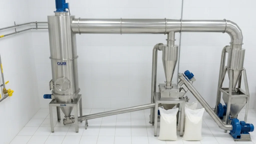 A indústria internacional utiliza sistemas de Flash Drying, onde a raiz ralada de mandioca (cassava) é seca instantaneamente em correntes de ar em alta temperatura. Esse processo resulta em uma farinha branca e estável, garantindo a padronização necessária para o uso em linhas de produção industrial.